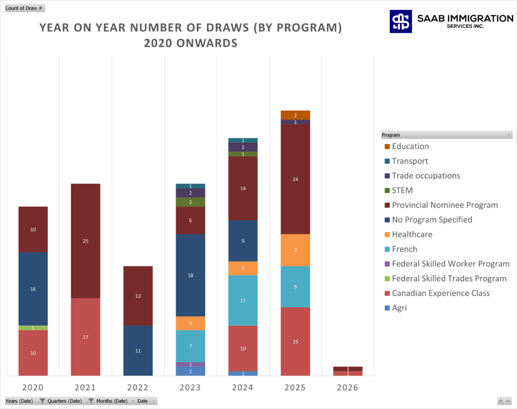 | Year | Agri | CEC | FSTP | FSWP | French | Healthcare | No Program Specified | PNP | STEM | Trade | Transport | Education | Total Draws |