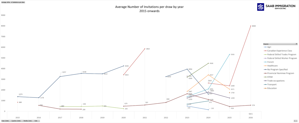 | Period | Agri | Canadian Experience Class | French | Healthcare | No Program Specified | Provincial Nominee Program | STEM | Trade | Transport | Education | Cumulative Avg. |