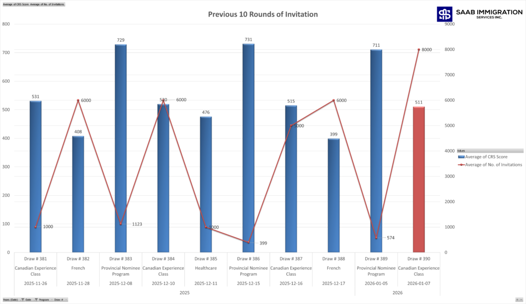 | Draw #389 | 5-Jan-26 | 711 | 574 | Provincial Nominee Program | 19 |